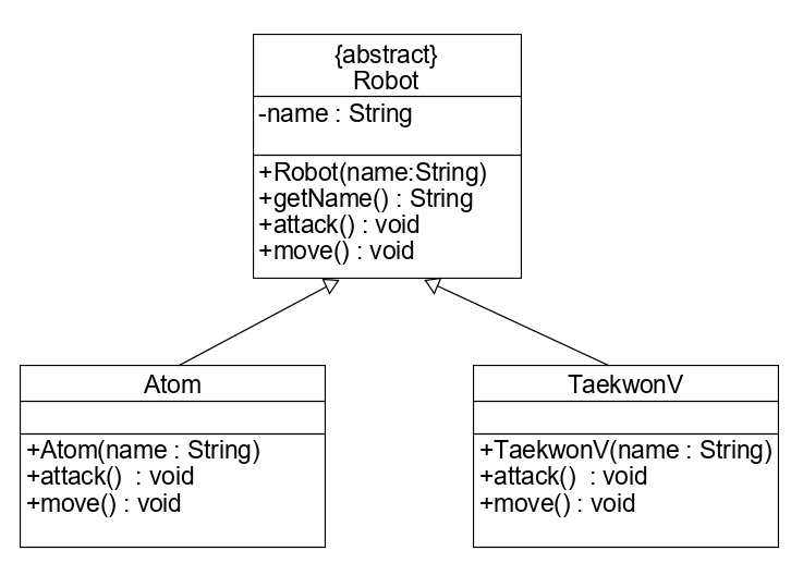 attack과 move 추상메소드는 자식클래스에서 재정의하도록 하였다. 왜냐하면 어떤 로봇인지에 따라 움직이는 방식, 공격하는 방식이 다르기 때문이다. Atom이 펀치를 날린다면, TaekwonV는 미사일을 발사한다.