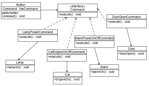 Command 인터페이스를 재구현하는 클래스를 만든다. 그리고 그 클래스는 행위의 대상을 의존하고 있으면 된다. 다른 클래스의 코드는 바뀌지 않는다. Button에서 Command 멤버 변수만 setter로 바꿔주면 된다. strategy pattern과 매우 유사한 구조이다.