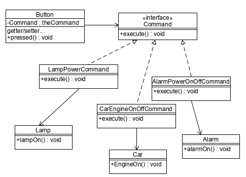 행위에 대한 큰 개념을 만들고 그 개념을 재구현하는 클래스를 만들면 된다. 재구현하는 클래스는 Lamp, Car, Alarm 클래스들을 가리킨다.