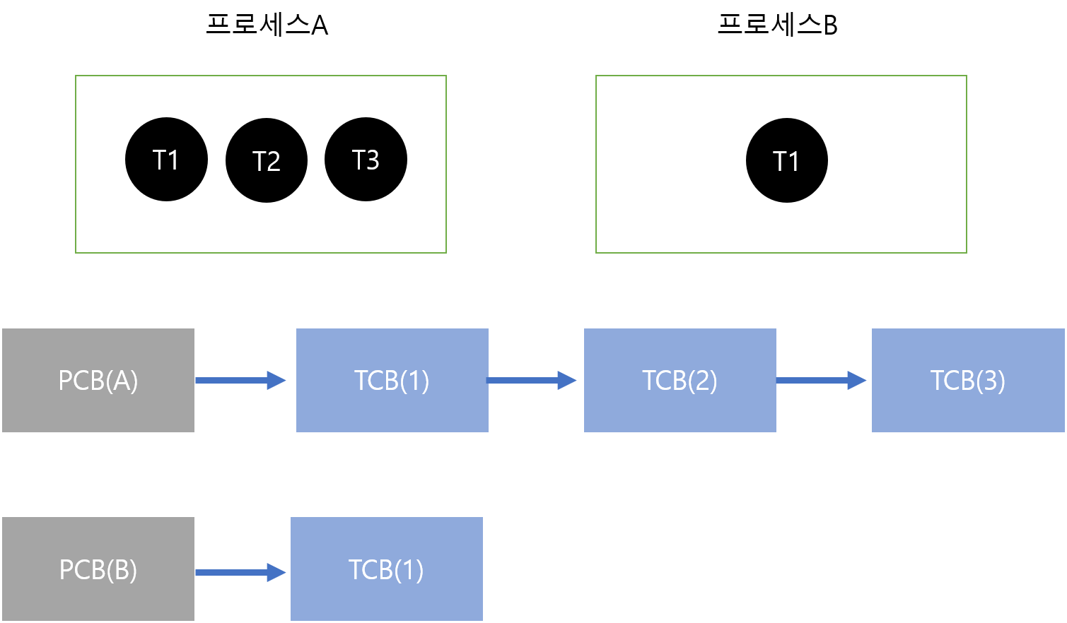 PCB A는 A의 프로세스 전체 정보를 가지고 있다. 그 중에서 프로세스는 Thread들을 LinkedList형식으로 저장한다.