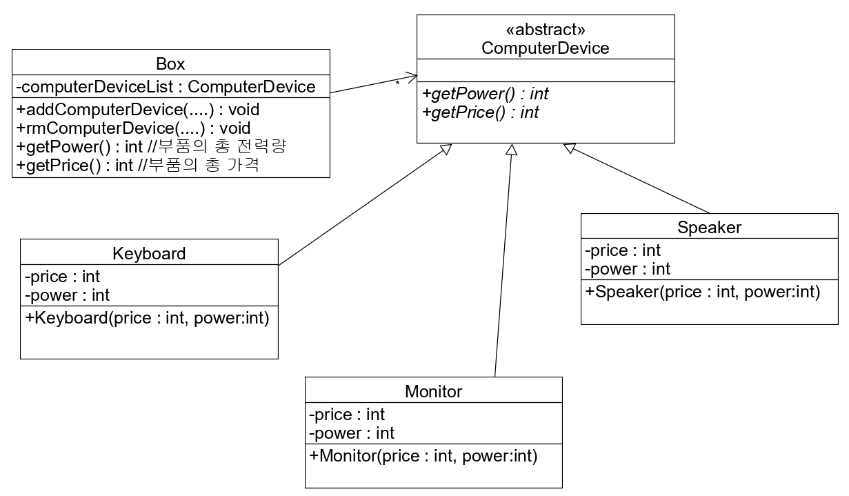 Box클래스가 ComputerDevice 클래스의 자식클래스가 된다면, Box클래스도 ComputerDevice와 같은 인터페이스를 가지게 된다. 그러면 Box와 ComputerDevice의 인터페이스가 구별되지 않는다.