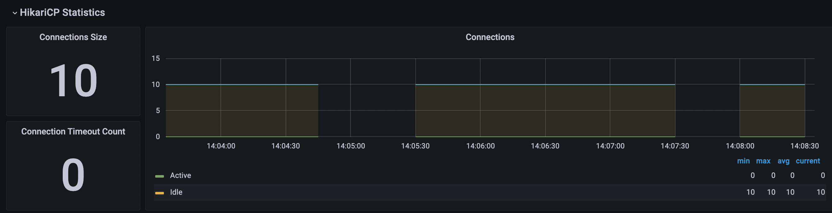 14시 08분에 테스트를 진행하였습니다. Connection Pool이 매우 안정적입니다. API의 상태코드도 모두 200입니다.