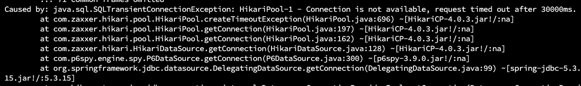 DB 쿼리를 하기 전에, Connection Pool에서 스레드를 가져와야하는데 30초 동안 대기해도 받을 수 없어서 SQLTransientConnectionException이 발생하였습니다.