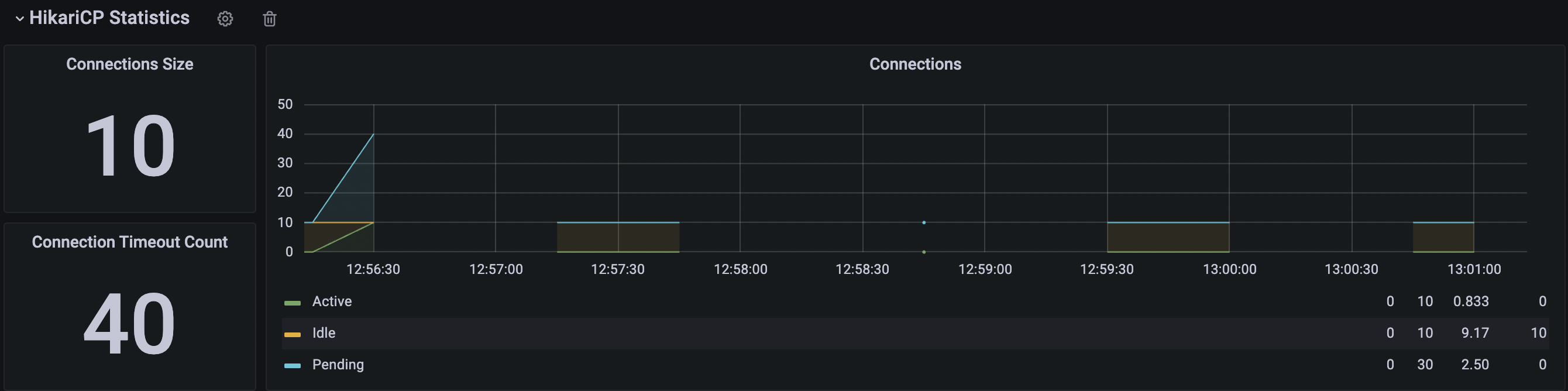 그라파나의 대시보드를 보면 12시 56분에 pending이 다수 발생하며 Connection Time out이 발생한 것을 볼 수 있습니다.